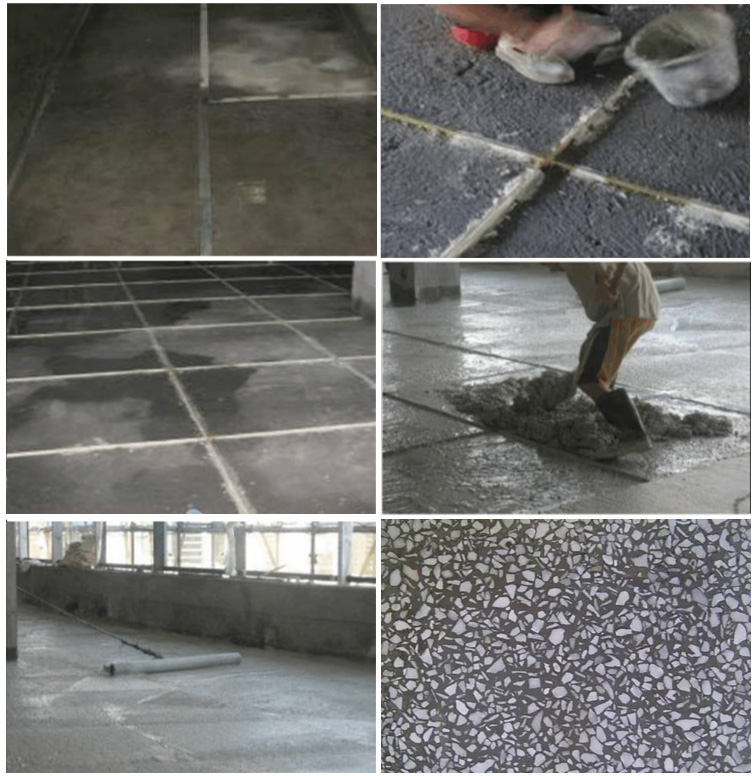 防靜電處理-接地線鋪設(shè)→基層處理→找平層→養(yǎng)護(hù)→鑲嵌分格條→清理找平層→涂刷結(jié)合層→鋪裝石粒漿滾壓密實(shí)→鋪壓抹平 →粗磨→細(xì)磨-磨光→清洗打蠟→檢測(cè)驗(yàn)收